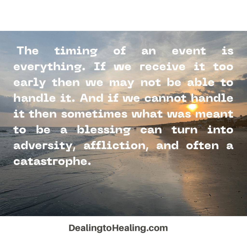 Sometimes our heart’s desires, our dreams, and our purpose is not revealed or come to fruition because we are not ready. The timing of an event is everything. If we receive it too early then we may not be able to handle it. And if we cannot handle it then sometimes what was meant to be a blessing can turn into adversity, affliction, and often a catastrophe.